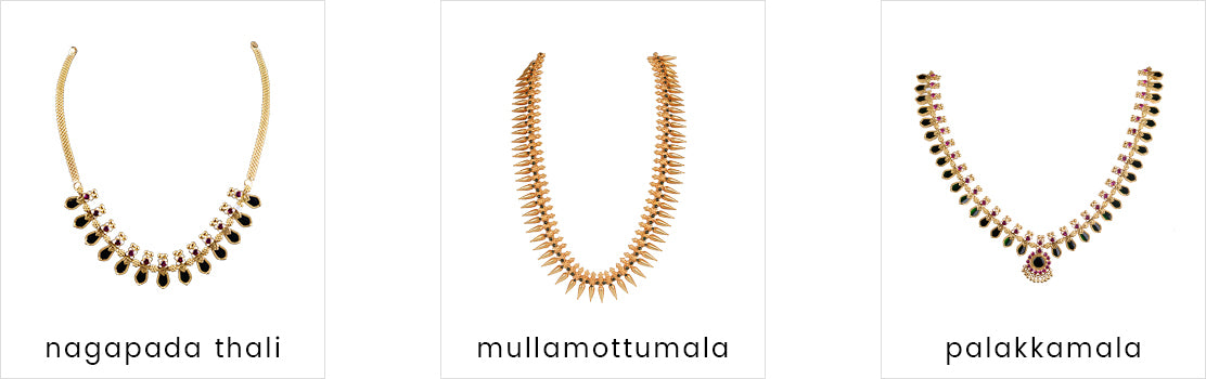 Palakamala, Pavithrakettu Mala, Randizha Manimala, Pichimottu Mala, Nagapada Thaali, Lashmi Mala, Pathakamala, Karimanimala, Gopi Palakamala, Thali Kootam, Kasu Mala, Mulla Mottu Mala, Manga Mala, Poothali.
